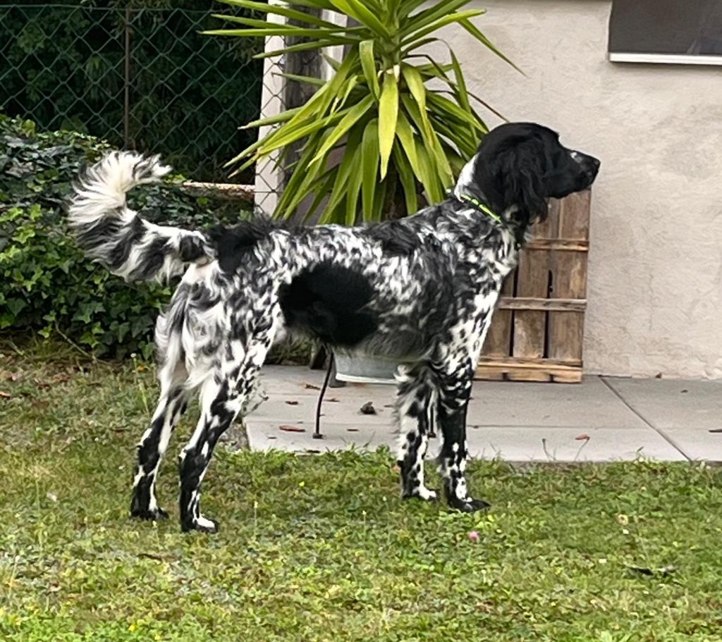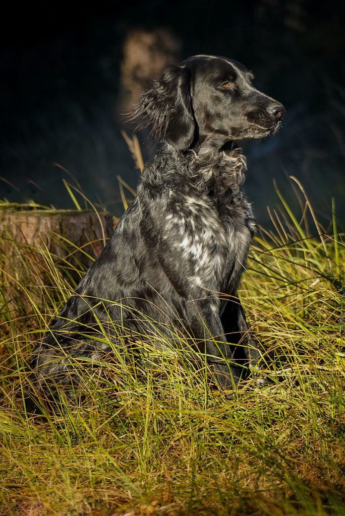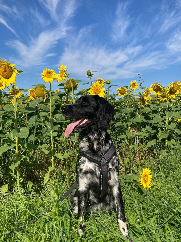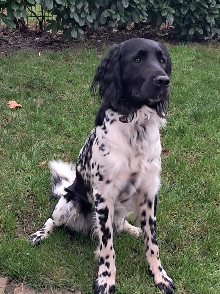 Sein markanter Kopf, das dunkle Schimmelfell und sein aufmerksamer Ausdruck machen ihn zu einem echten Hingucker – ein Großer Münsterländer, wie man ihn sich nur wünschen kann.